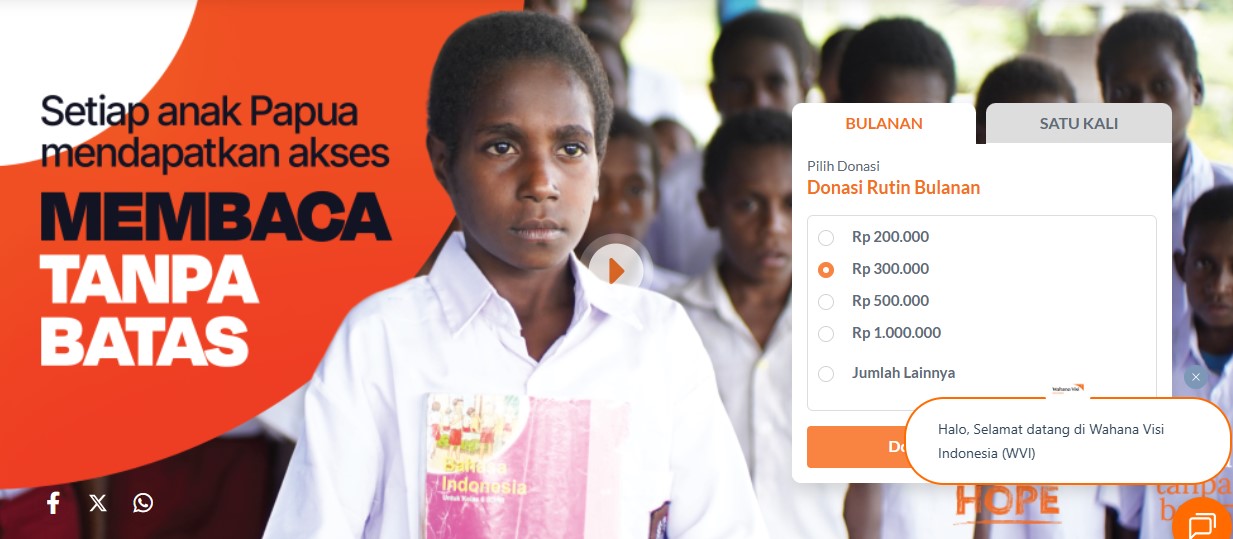 Setiap anak berhak memiliki masa depan yang penuh harapan. Melalui donasi hadiah dan dukungan donasi satu kali bersama Wahana Visi, kebaikan Anda akan menjadi wujud nyata yang menguatkan generasi penerus bangsa. Mari ambil bagian sekarang dan jadikan kasih Anda sebagai harapan baru untuk anak Indonesia.